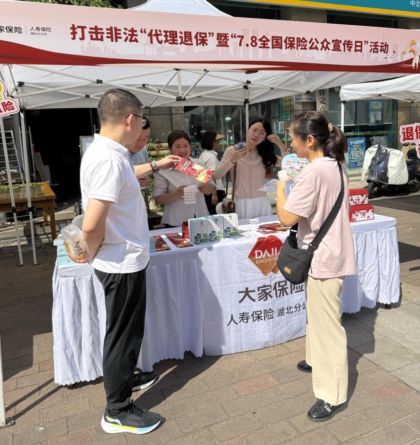 7月5日,在2025年“7.8全國保險公眾宣傳日”來臨之際,大家人壽湖北分公司與武漢市12家金融機構一道,冒著酷暑走進武昌區(qū)復地東湖國際武重社區(qū),積極參加由國家金融監(jiān)督管理總局湖北監(jiān)管局領導、湖北省保險行業(yè)協(xié)會指導、極目新聞主辦的“向非法代理退保說不,我們在行動”宣傳活動。本次活動以打擊非法“代理退?!濒摺?.8全國保險公眾宣傳日”為主題,吸引了眾多社區(qū)居民參與,以豐富多元的形式掀起社區(qū)公眾反詐防騙熱潮。
