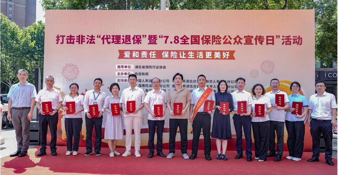 活動現(xiàn)場,大家人壽湖北分公司代表與12家金融機構代表聯(lián)合發(fā)起倡議,鄭重宣讀《打擊非法代理退保承諾書》,展現(xiàn)行業(yè)堅決打擊非法“代理退?!焙诨耶a(chǎn)的決心。國家金融監(jiān)督管理總局湖北監(jiān)管局、湖北省保險行業(yè)協(xié)會和極目新聞相關領導共同為現(xiàn)場保險公司頒發(fā)“打擊非法‘代理退?!蠕h單位”榮譽證書,倡議行業(yè)助力保險消費者守護好“錢袋子”。