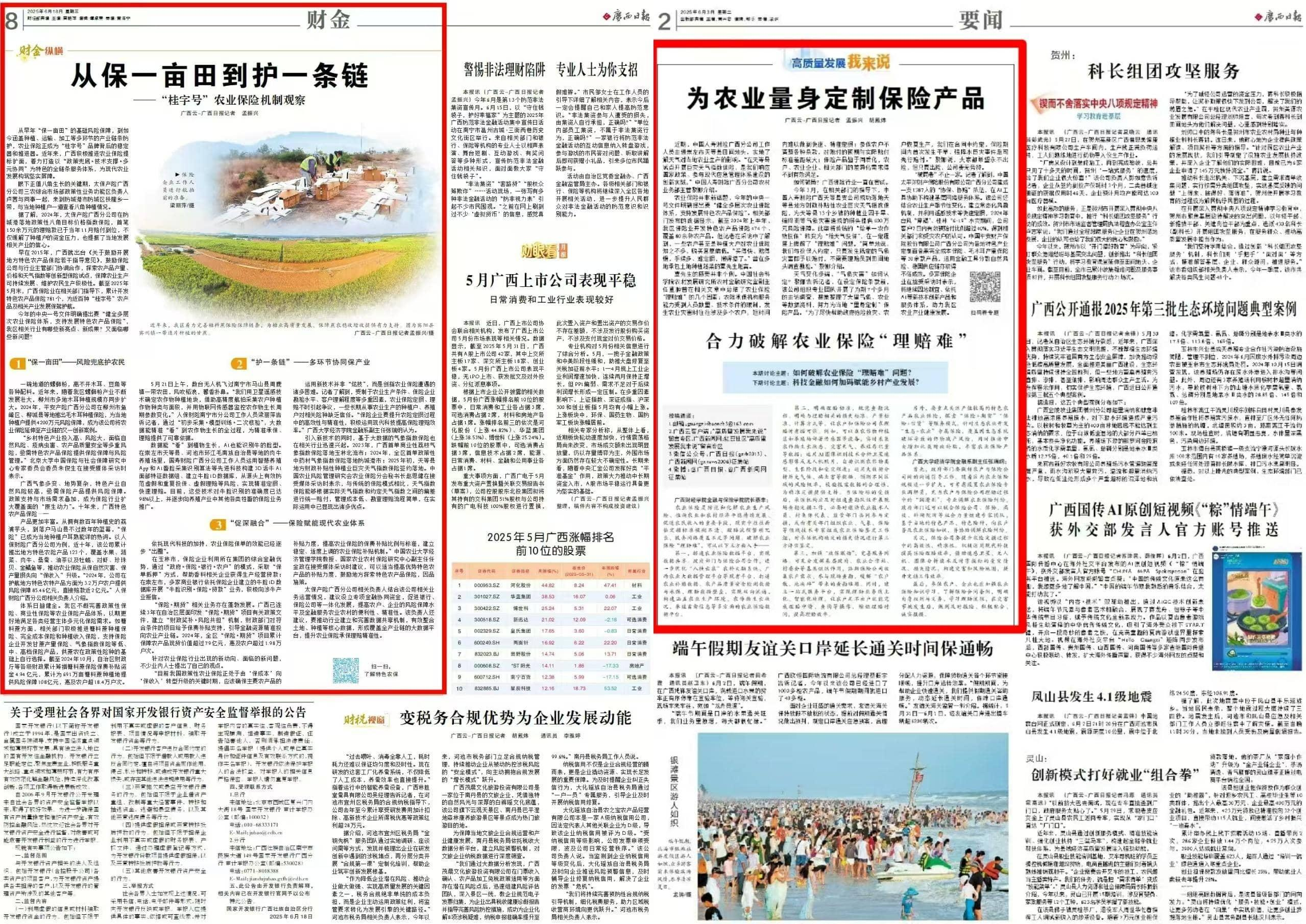 一是緊跟社會(huì)熱點(diǎn),以“小切口”引出行業(yè)“大變化”。在講好廣西保險(xiǎn)行業(yè)高質(zhì)量發(fā)展故事,助力唱響中國經(jīng)濟(jì)光明論方面,協(xié)會(huì)與廣西日?qǐng)?bào)深度合作,從4個(gè)“小切口”引出行業(yè)“大變化”:在廣西日?qǐng)?bào)刊登長篇深度報(bào)道《給螺螄粉店“上保險(xiǎn)”》《誰來給靈活就業(yè)人員“上保險(xiǎn)”?》《為農(nóng)業(yè)量身定制保險(xiǎn)產(chǎn)品》《從保一畝田到護(hù)一條鏈——“桂字號(hào)”農(nóng)業(yè)保險(xiǎn)機(jī)制觀察》。