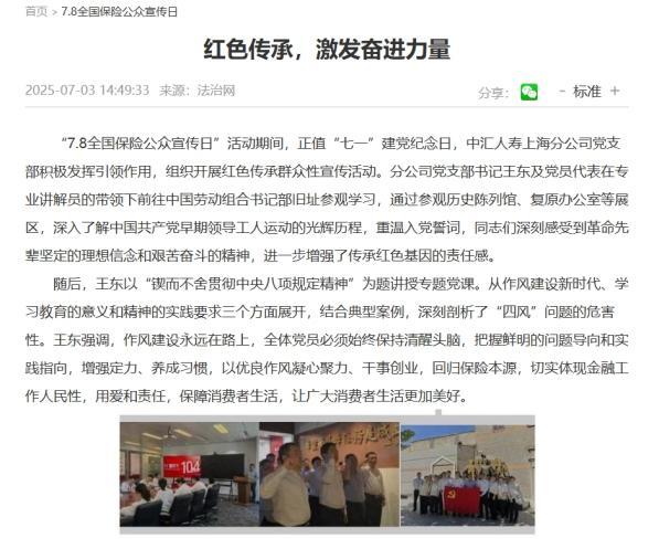 積極與外部媒體溝通合作,投稿文案、視頻等宣傳素材。在財經(jīng)網(wǎng)、法治日報、搜狐網(wǎng)、新浪網(wǎng)等平臺發(fā)表多篇關于公司在“7.8全國保險公眾宣傳日”活動期間的報道,內(nèi)容涵蓋公司的各項活動舉措、風險提示文章、紅色傳承活動、公益活動成果等。