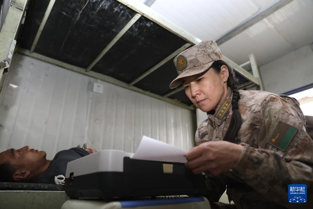 聯(lián)勤保障部隊第941醫(yī)院重癥醫(yī)學科主任張瑛在高海拔哨所巡診(2022年3月20日攝)。新華社發(fā)(孟釗 攝)