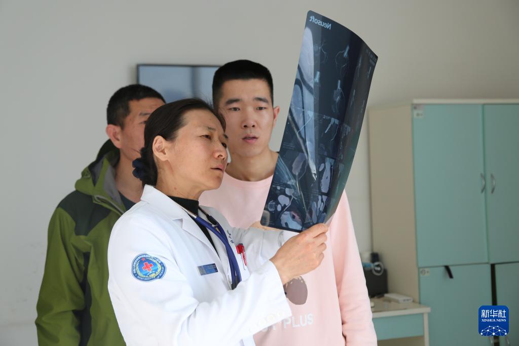 聯(lián)勤保障部隊(duì)第941醫(yī)院重癥醫(yī)學(xué)科主任張瑛在高海拔哨所巡診(2022年3月20日攝)。新華社發(fā)(孟釗 攝)