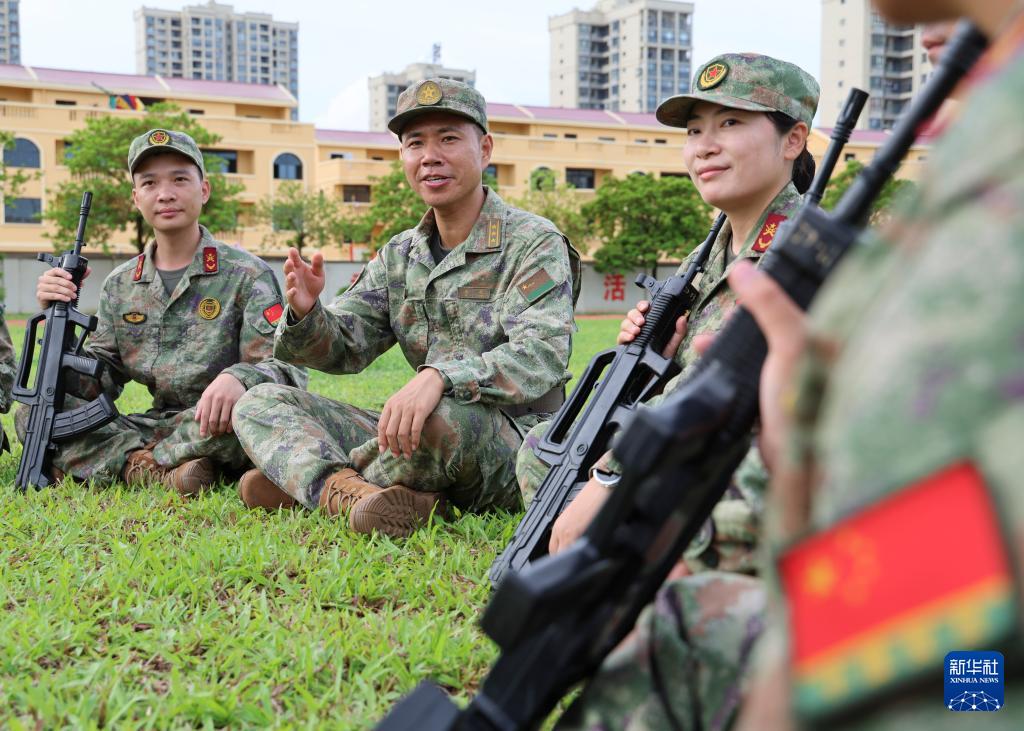 廣西軍區(qū)某部謝亮(左二)與參訓民兵談心交流(資料照片)。 新華社發(fā)(梁凱昌攝)