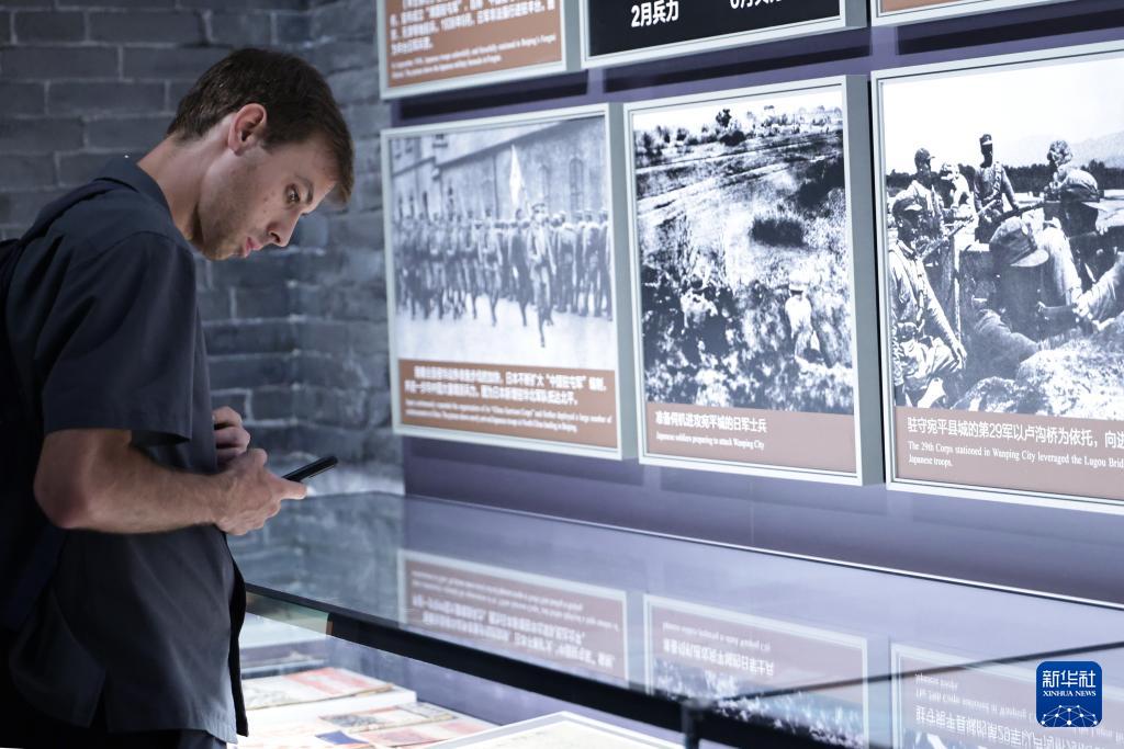 8月27日,中外媒體記者在中國人民抗日戰(zhàn)爭紀(jì)念館內(nèi)采訪。新華社記者 張玉薇 攝