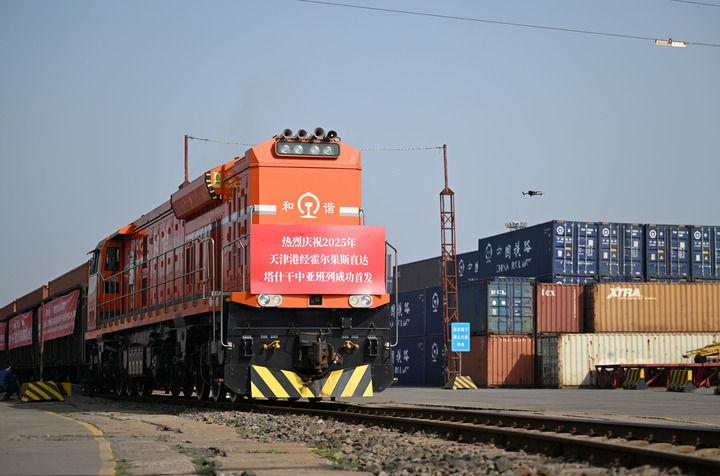 2025年首列天津港經(jīng)霍爾果斯直達塔什干的中亞班列從天津港物捷三堆場發(fā)車(2025年5月20日攝)。新華社記者 趙子碩 攝