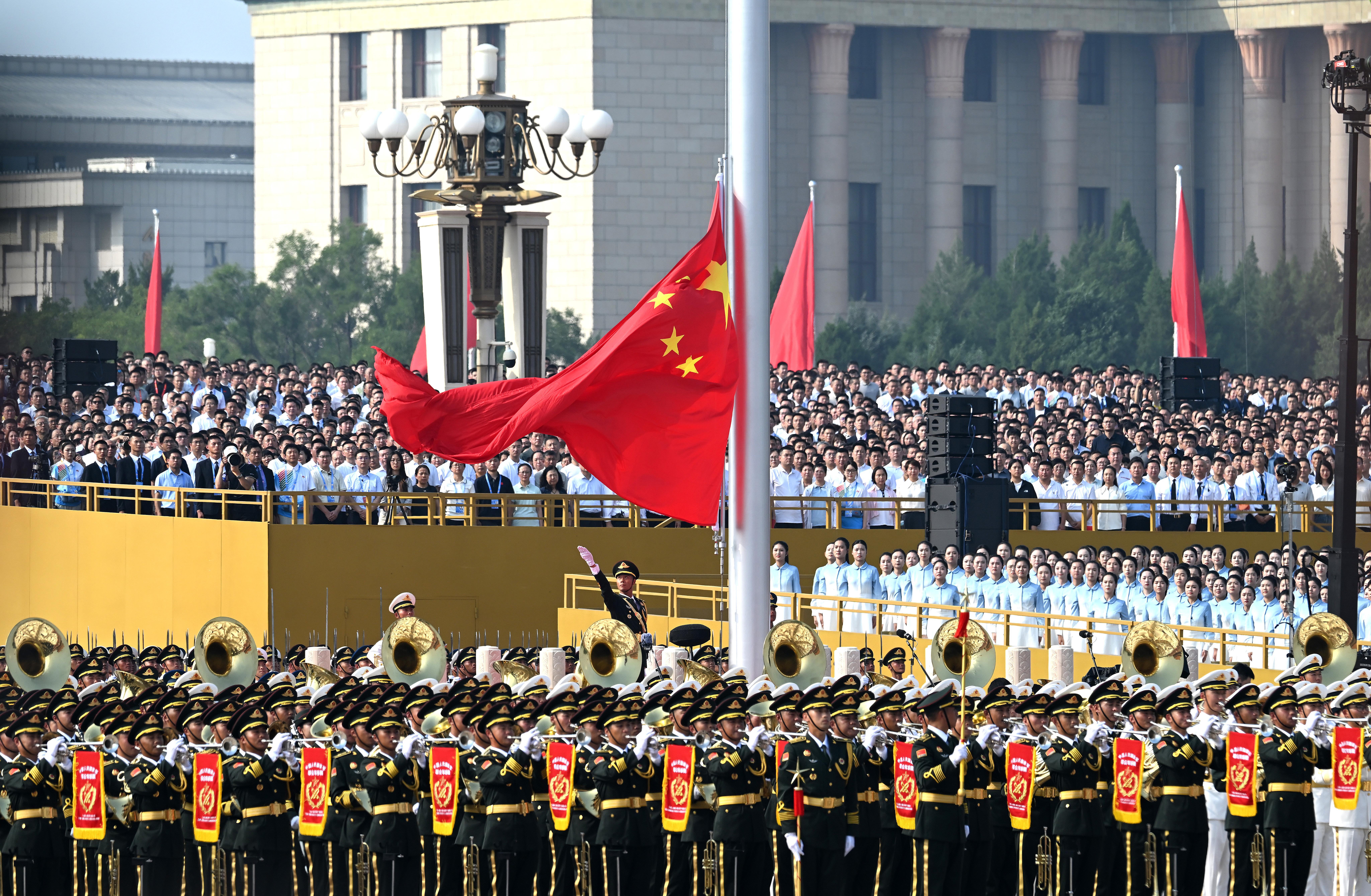9月3日,紀(jì)念中國(guó)人民抗日戰(zhàn)爭(zhēng)暨世界反法西斯戰(zhàn)爭(zhēng)勝利80周年閱兵式在北京隆重舉行。這是天安門(mén)廣場(chǎng)舉行升國(guó)旗儀式。