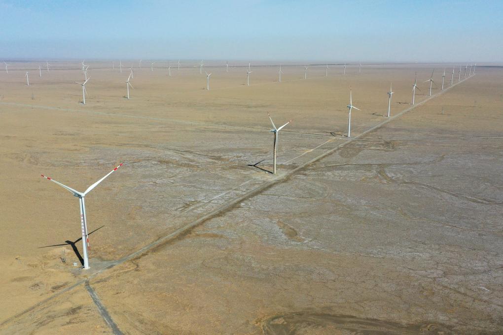這是在新疆巴音郭楞蒙古自治州若羌縣拍攝的新天綠色能源股份有限公司新天若羌縣羅布莊10萬千瓦風電項目(6月27日攝,無人機照片)。新華社記者 丁磊 攝