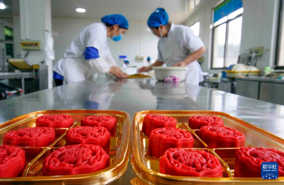 9月23日,在河北遵化市西三里鎮(zhèn)一家糕點加工企業(yè),工人在車間制作“喜”字紅月餅。