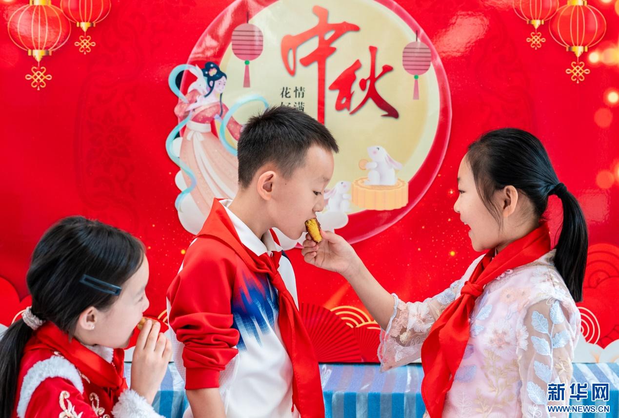 9月28日,呼和浩特市玉泉區(qū)清泉街小學學生在中秋節(jié)主題活動上品嘗自己制作的月餅。新華網(wǎng)發(fā)(丁根厚 攝)