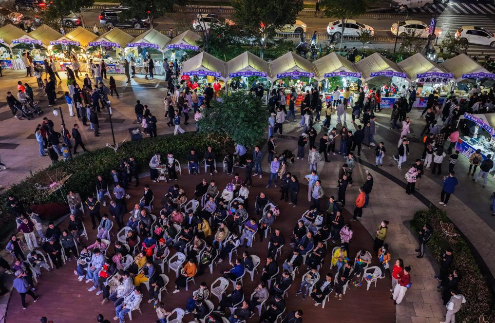 11月7日,依托當(dāng)晚在西施籃球中心舉辦的系列演唱會(huì),“陶你所需·朱市云集”社區(qū)共富市集吸引了大批市民游客(無人機(jī)照片)。新華社記者 徐昱 攝