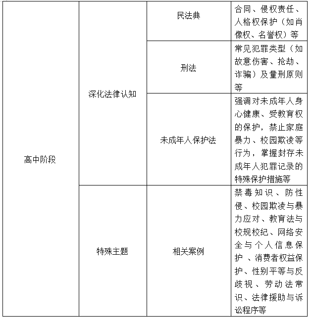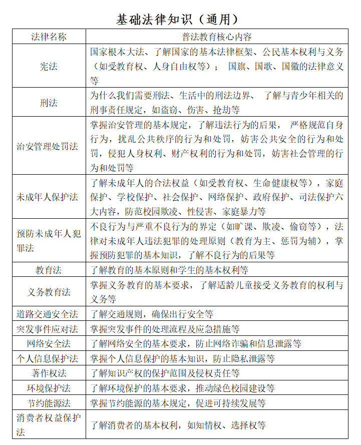 普法教育應(yīng)針對不同年齡段的學(xué)生開展有實效的普法教育,充分考慮不同年齡段的學(xué)生特點,提供定制化的普法教育內(nèi)容。普法內(nèi)容必須保持時效性與前瞻性,普法教育者應(yīng)及時關(guān)注最新的法律法規(guī)和司法實踐成果,并將其融入到校園普法教育中,為學(xué)生提供最新、最準(zhǔn)確的法律知識。以下是學(xué)校中小學(xué)生普法教育核心內(nèi)容清單之一,供參考。