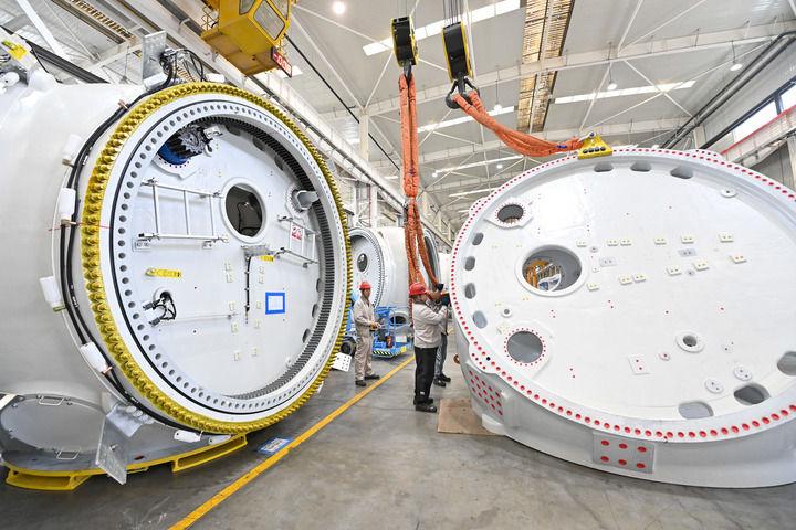 2025年9月24日,工人在位于山西轉型綜合改革示范區(qū)的太重集團新能源產業(yè)園區(qū)吊運風電裝備。新華社記者 楊晨光 攝