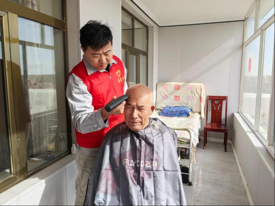圖為烏力吉檢修人員為牧民大爺理發(fā) 張晉宇 攝