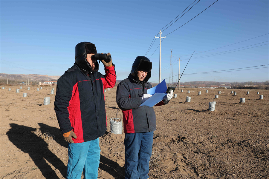 圖為國網(wǎng)山西長治上黨區(qū)供電公司西池供電所所長陳朋飛和同事在電采暖農(nóng)戶院中,巡視檢查供電線路的末端開關(guān)。