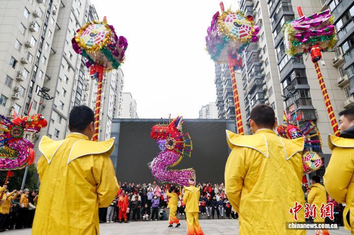 2月27日,湖北武漢,國家級非遺漢陽高龍走進(jìn)社區(qū)進(jìn)行表演,以傳統(tǒng)民俗為居民送上馬年元宵祝福。圖為高龍表演吸引民眾觀看。中新社記者 張暢 攝