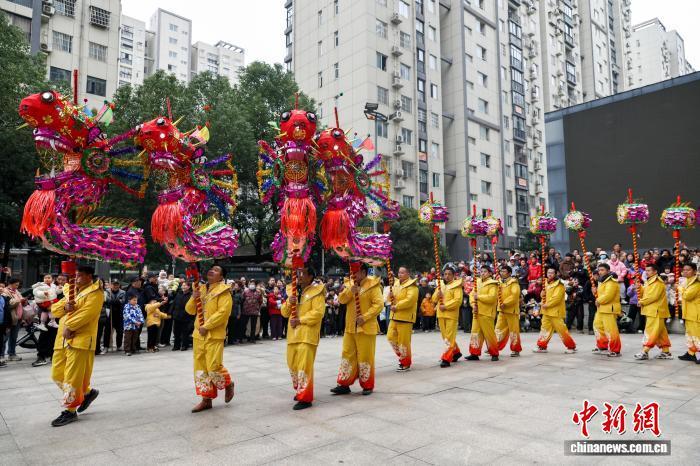2月27日,湖北武漢,國(guó)家級(jí)非遺漢陽(yáng)高龍走進(jìn)社區(qū)進(jìn)行表演,以傳統(tǒng)民俗為居民送上馬年元宵祝福。圖為高龍隊(duì)隊(duì)員們?yōu)榫用襁M(jìn)行表演。中新社記者 張暢 攝