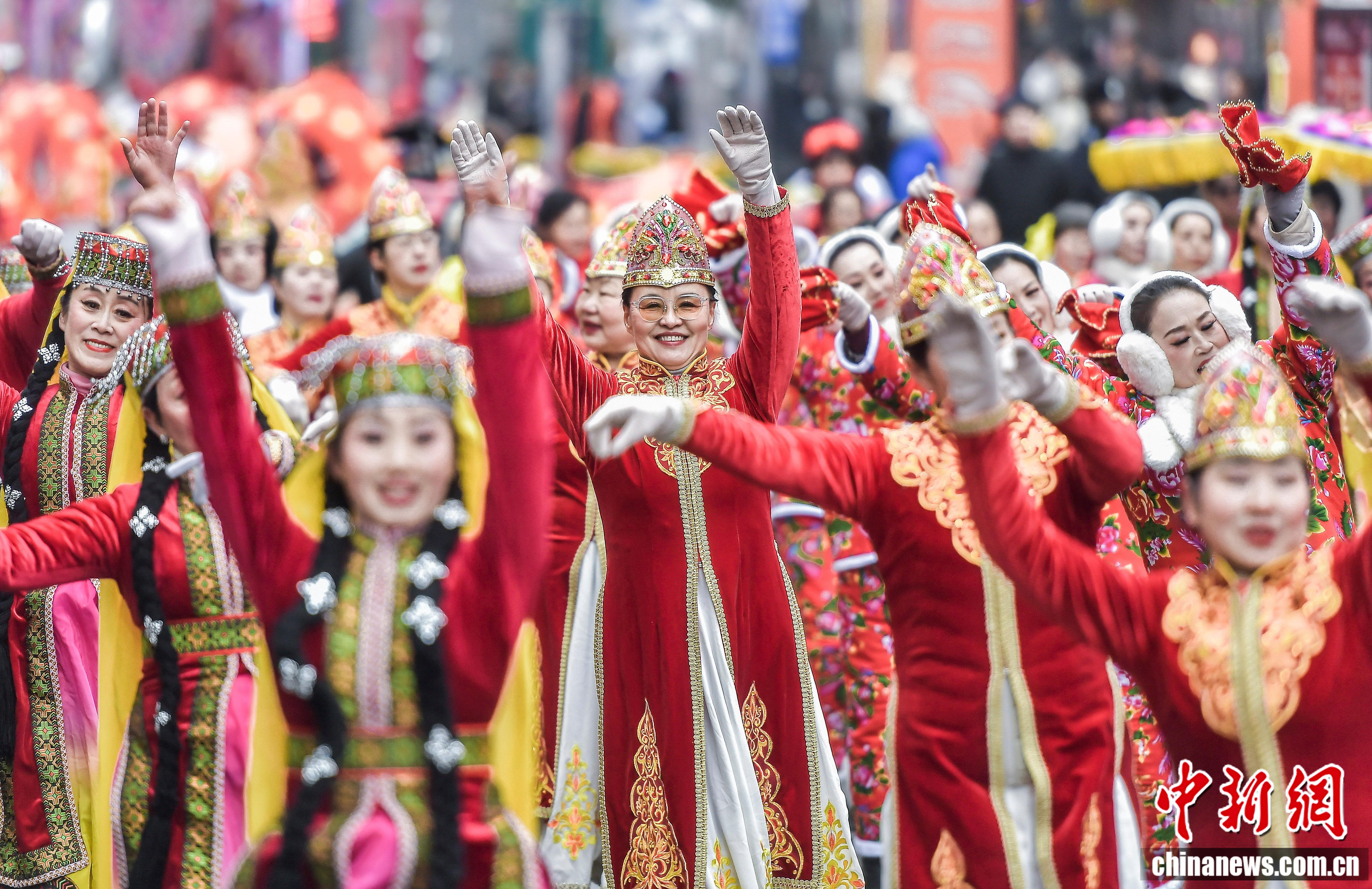 2026年2月5日,新疆烏魯木齊市鬧市區(qū)西門老街鑼鼓喧天,一場社火展演游街活動在此舉行,圖為社火隊伍的服飾、舞蹈等融入諸多新疆元素。中新社記者 劉新 攝