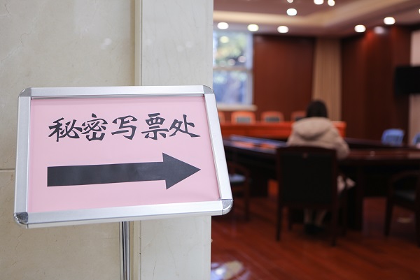 投票站內(nèi)氣氛莊重嚴(yán)肅、設(shè)置井然有序。五星紅旗鮮艷奪目,懸掛正中,三個(gè)投票箱呈品字型端立前方,票箱上鑲嵌的國(guó)徽熠熠生輝,驗(yàn)證處、領(lǐng)票處、寫票處、秘密寫票處分區(qū)設(shè)置,印有三名正式代表候選人基本情況的展板擺放醒目,方便選民了解情況。
