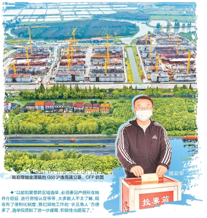 在長(zhǎng)三角示范區(qū)工作和生活的非本地戶籍的吳江籍、嘉善籍和青浦籍流動(dòng)人口,可以在試點(diǎn)范圍內(nèi)的居住地或工作單位進(jìn)行選民登記并依法參加選舉,無(wú)須選民本人回戶籍所在地開(kāi)具選民資格證明,同時(shí)確保一位選民在一次選舉中有且只有一次參與權(quán),避免兩地參選或當(dāng)選。據(jù)統(tǒng)計(jì),青浦籍與吳江籍、嘉善籍選民在本次試點(diǎn)工作中異地登記參選的選民逾800人,龐云華就是其中之一。