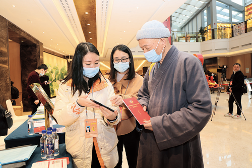 “掌上”辦公是福建省政協(xié)十二屆五次會議的一大亮點。政協(xié)委員收集到的社情民意、百姓心聲,可通過“掌上”辦公,形成全流程覆蓋、全天候在線的履職形態(tài)。圖為工作人員在會議間隙指導(dǎo)委員如何使用“掌上”辦公系統(tǒng)。 王惠兵 攝