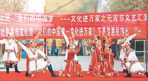 “火紅的燈籠掛起來(lái),熱鬧的燈謎猜起來(lái),甜蜜的元宵吃起來(lái)?!?月14日元宵節(jié)前夕,新疆維吾爾自治區(qū)吐魯番市高昌區(qū)政協(xié)“訪惠聚”駐廣匯社區(qū)工作隊(duì)組織轄區(qū)群眾開(kāi)展“我們的中國(guó)夢(mèng)”文化進(jìn)萬(wàn)家之元宵節(jié)文藝演出活動(dòng),共迎元宵佳節(jié)。 壽偉 攝