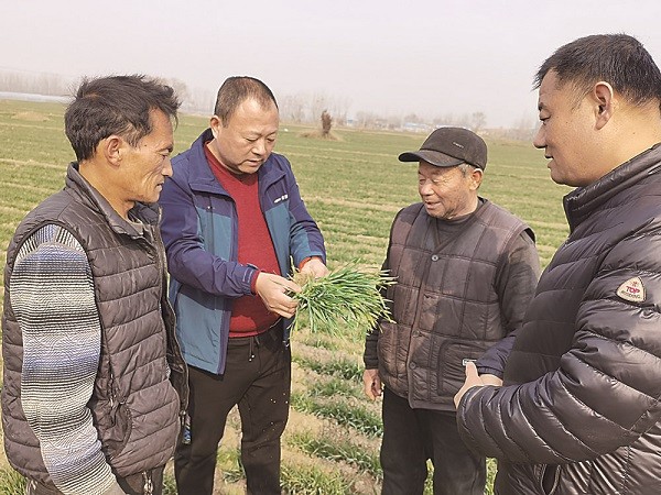 近日,山東省菏澤市牡丹區(qū)政協(xié)組織委員來(lái)到田間地頭,實(shí)地查看土地墑情和小麥生長(zhǎng)情況。為群眾講解當(dāng)下麥田管理的良方,給農(nóng)民送來(lái)了金點(diǎn)子。圖為區(qū)政協(xié)委員、高級(jí)農(nóng)藝師付志偉(左二)在給農(nóng)民講解防蟲(chóng)害知識(shí)。王文 姜維 攝