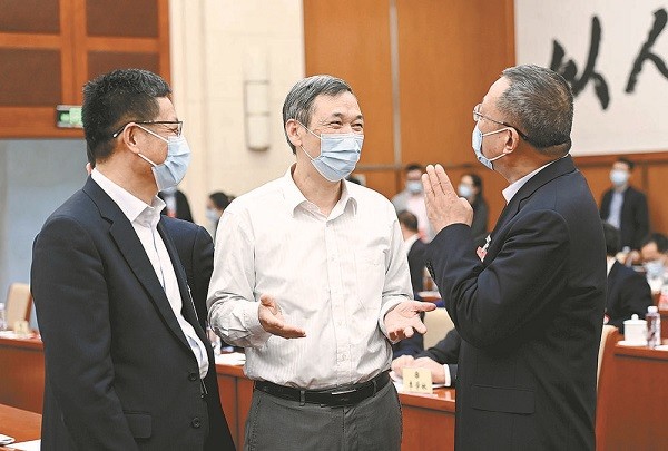 3月7日,在鴻府大廈駐地,黃潤秋、喬旭、劉聰(從左至右)三位委員圍繞“深入打好污染防治攻堅戰(zhàn)”的話題進(jìn)行討論。本報記者 齊波 攝