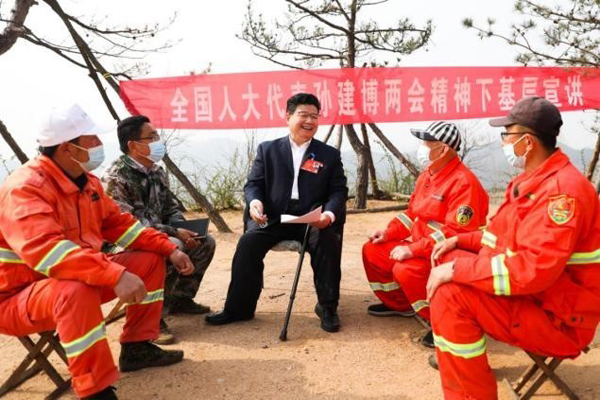 “抓嚴抓實疫情防控和森林防火工作,守住防疫底線,筑牢生態(tài)紅線,全力守護來之不易的綠水青山?!睂O建博第一站來到原山林場嶺西營林區(qū),與護林防火一線人員圍坐在一起,深入傳達全國兩會精神。孫建博關(guān)心他們的工作和生活狀況,激勵大家用兩會精神指導(dǎo)實踐,堅決打贏疫情防控和森林防火兩場硬仗。