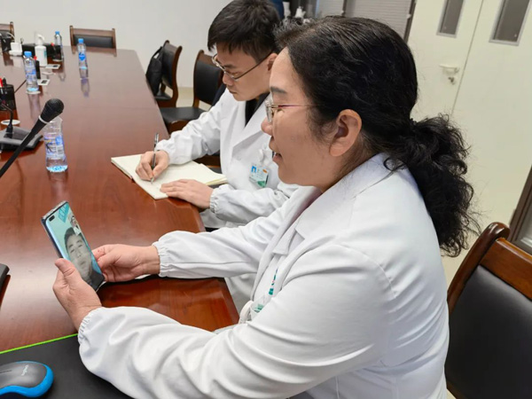 全國人大代表、南昌大學(xué)第一附屬醫(yī)院院長張偉為患者進行遠距離視頻問診。(江西省人大常委會供圖)