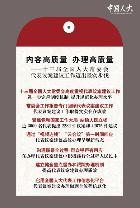 這一建議辦理事例,也是十三屆全國人大常委會在辦理代表議案建議中積極踐行全過程人民民主的鮮活例證。