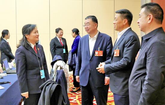 圖① 3月10日,十四屆全國人大四次會議山東省代表團舉行小組會議,審議“兩高”工作報告。圖為代表在會后和“兩高”工作人員交流。