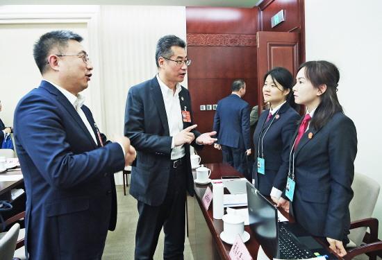 圖② 3月9日,全國政協(xié)十四屆四次會議舉行小組會議。天津市律師協(xié)會會長牛同栩委員(左一)、上海市新的社會階層人士聯誼會會長張毅委員(左二)會后和“兩高”工作人員就“兩高”工作報告溝通交流。