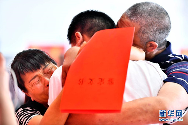 6月8日,在“認親,我們在行動”濟南主會場,張某(左)和吳某林(右)擁抱著被拐的兒子。新華社記者 郭緒雷 攝
