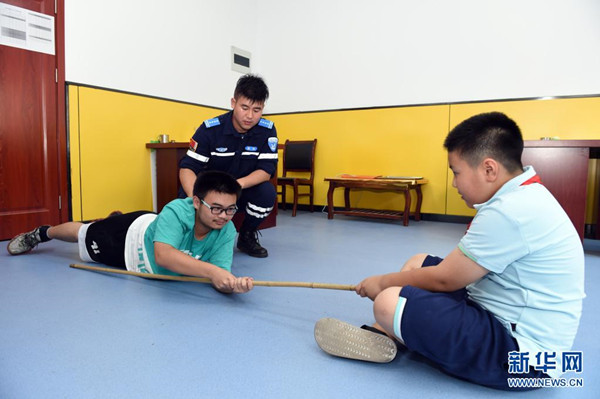 7月15日,在合肥市常青街道姚公社區(qū),合肥市水上應(yīng)急救援隊(duì)的隊(duì)員用現(xiàn)場演練的形式為孩子們介紹溺水后自救互救知識?!?/span>