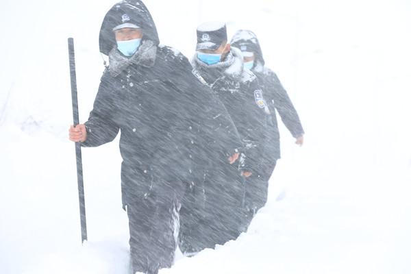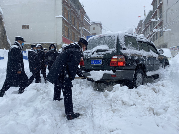 “這是我看到過最厚的一場雪,我們必須要以風雪為令,以雪情為警情,守護好邊境群眾的生命財產安全。”移民管理警察拉加東主說:“后面同志走快點,前面有受困車輛需要幫忙,我們集體上前搭把手”。