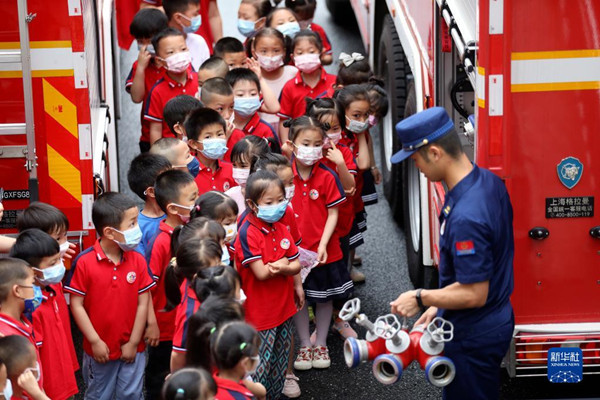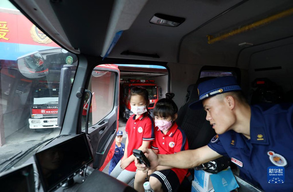 5月30日,在湖南省資興市消防救援大隊,小朋友們在消防員的帶領(lǐng)下參觀消防車。