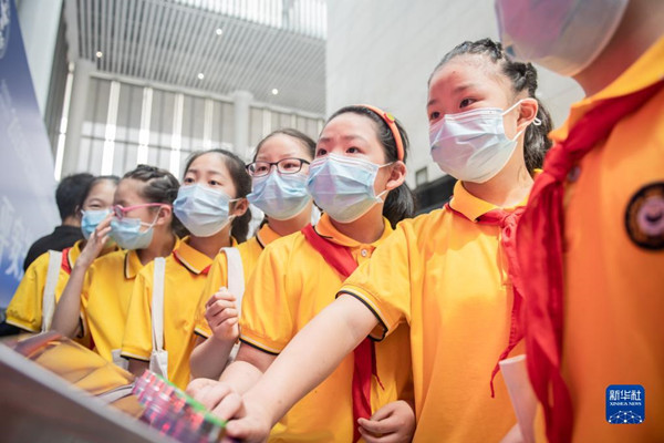 6月23日,小朋友們參觀人體吸毒血液演示模型。