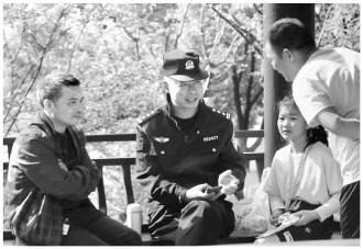 浙江省龍游縣公安局小南海派出所近日以“警務(wù)融治”建設(shè)為載體,創(chuàng)新組建護(hù)村、護(hù)企、護(hù)港、護(hù)林等專業(yè)義警隊(duì)伍。圖為林區(qū)警長為群眾開展普法宣傳。