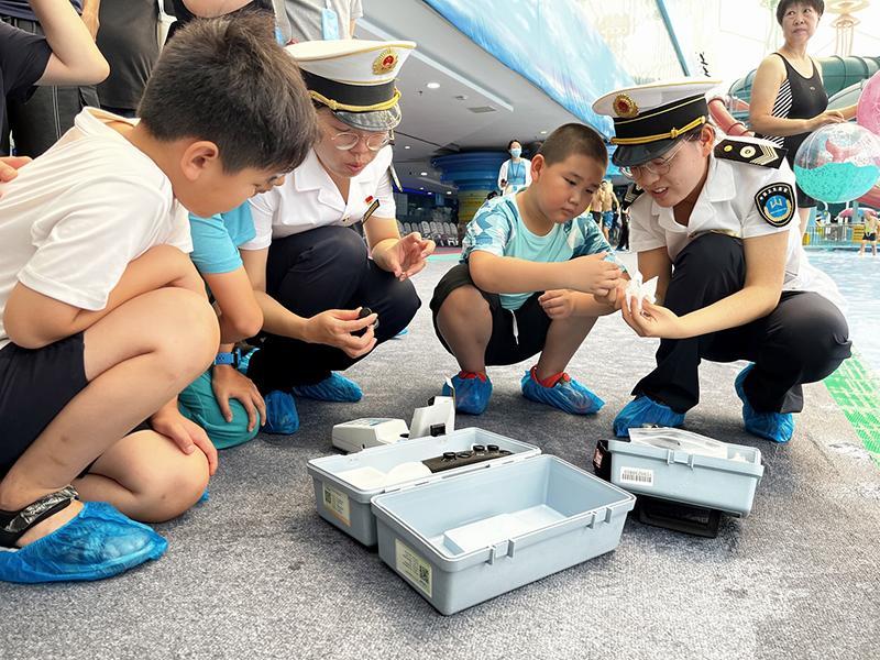 7月19日,北京市衛(wèi)生健康監(jiān)督所開展“關(guān)注泳池水質(zhì) 體驗(yàn)衛(wèi)監(jiān)執(zhí)法”開放日活動(dòng),邀請市民朋友走進(jìn)水立方嬉水樂園,親身體驗(yàn)游泳場所衛(wèi)生監(jiān)督全過程。圖為衛(wèi)生監(jiān)督員邀請小朋友一同體驗(yàn)快速檢測泳池水余氯情況。