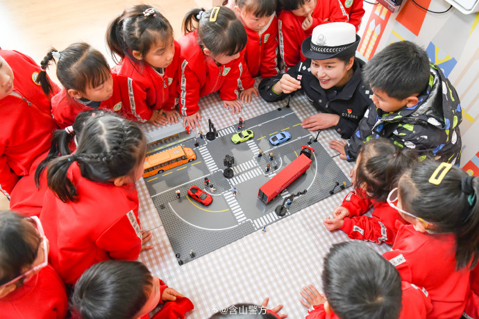 近日,安徽省含山縣公安局交管大隊(duì)組織民警走進(jìn)幼兒園開展以“小手拉大手 安全文明出行”為主題的交通安全宣傳活動(dòng),增強(qiáng)幼兒道路交通安全意識(shí)。圖為民警通過模擬道具與孩子們互動(dòng)交流。