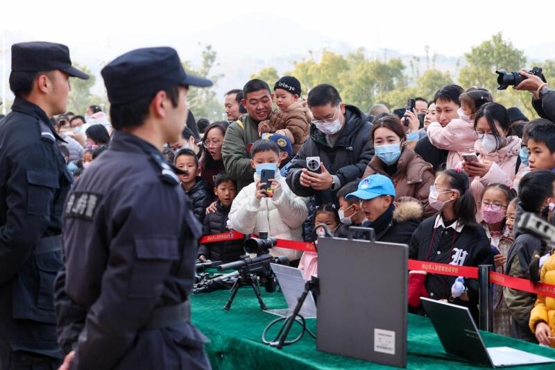 警察節(jié)到來之際,浙江省舟山市公安局近日在市綜合警務(wù)訓(xùn)練基地舉行警營開放日活動,市民現(xiàn)場零距離體驗警務(wù)裝備以及觀看警用無人機、警用摩托車、重裝防爆小隊技戰(zhàn)術(shù)等科目表演。圖為市民零距離體驗警務(wù)裝備。