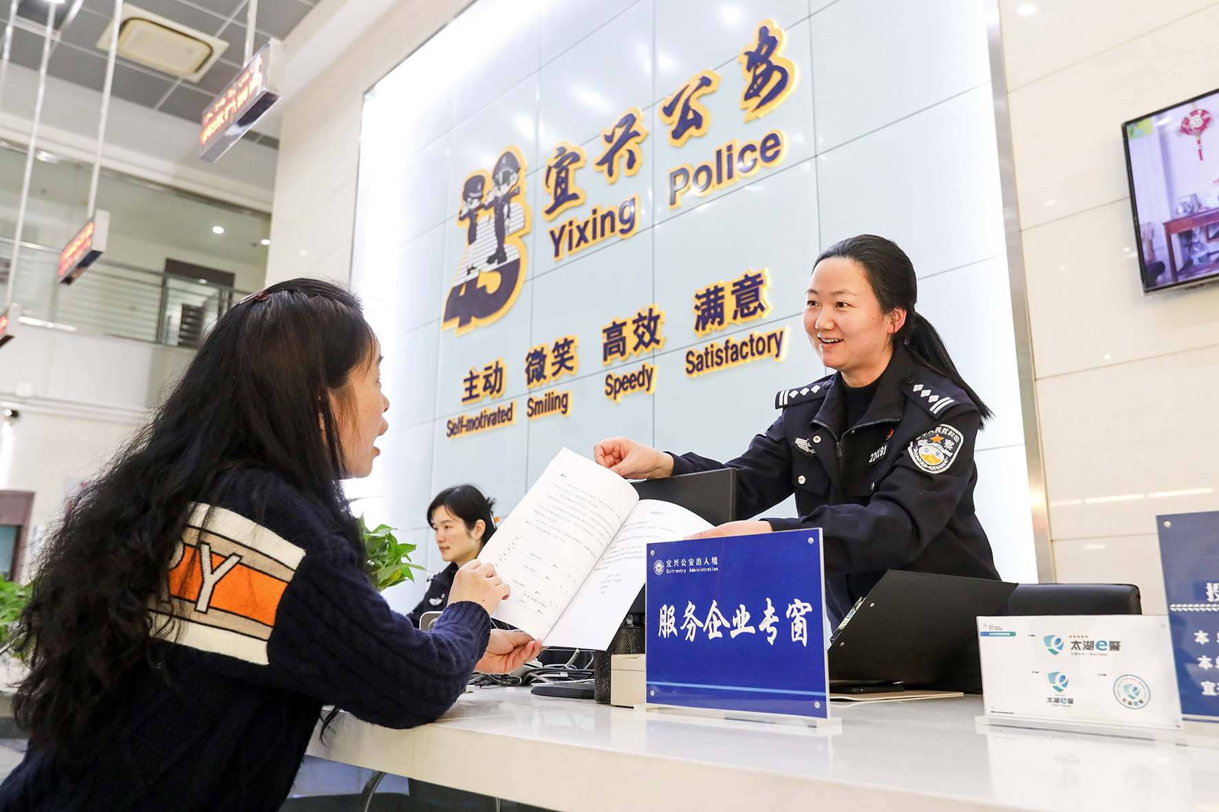 1月15日,江蘇省宜興市公安局出入境管理大隊民警向企業(yè)人員介紹商務(wù)簽注辦理流程。