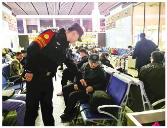 圖為民警提醒夜間候車旅客注意保管隨身物品。