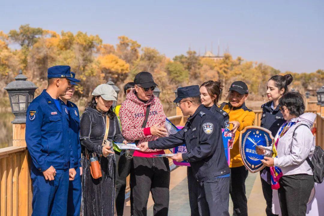 近日,新疆維吾爾自治區(qū)巴楚縣公安局采取“反詐+護(hù)游”方式,在當(dāng)?shù)丶t海景區(qū)保障平安出游的同時,進(jìn)行防范電信網(wǎng)絡(luò)詐騙宣傳。圖為民輔警在景區(qū)向游客宣傳反詐知識。