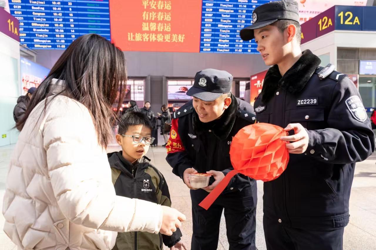 2月12日是農(nóng)歷元宵佳節(jié),北京鐵路公安處北京南站派出所民警走到旅客中間,開展安全出行猜燈謎活動(dòng)。據(jù)悉,鐵路民警制作的燈謎謎面涵蓋反詐宣傳、乘車安全、平安出行常識(shí)等內(nèi)容,并結(jié)合春運(yùn)出行,提醒旅客旅途中提高安全防范意識(shí)。圖為民警邀請(qǐng)旅客猜燈謎并送上可口的元宵。
