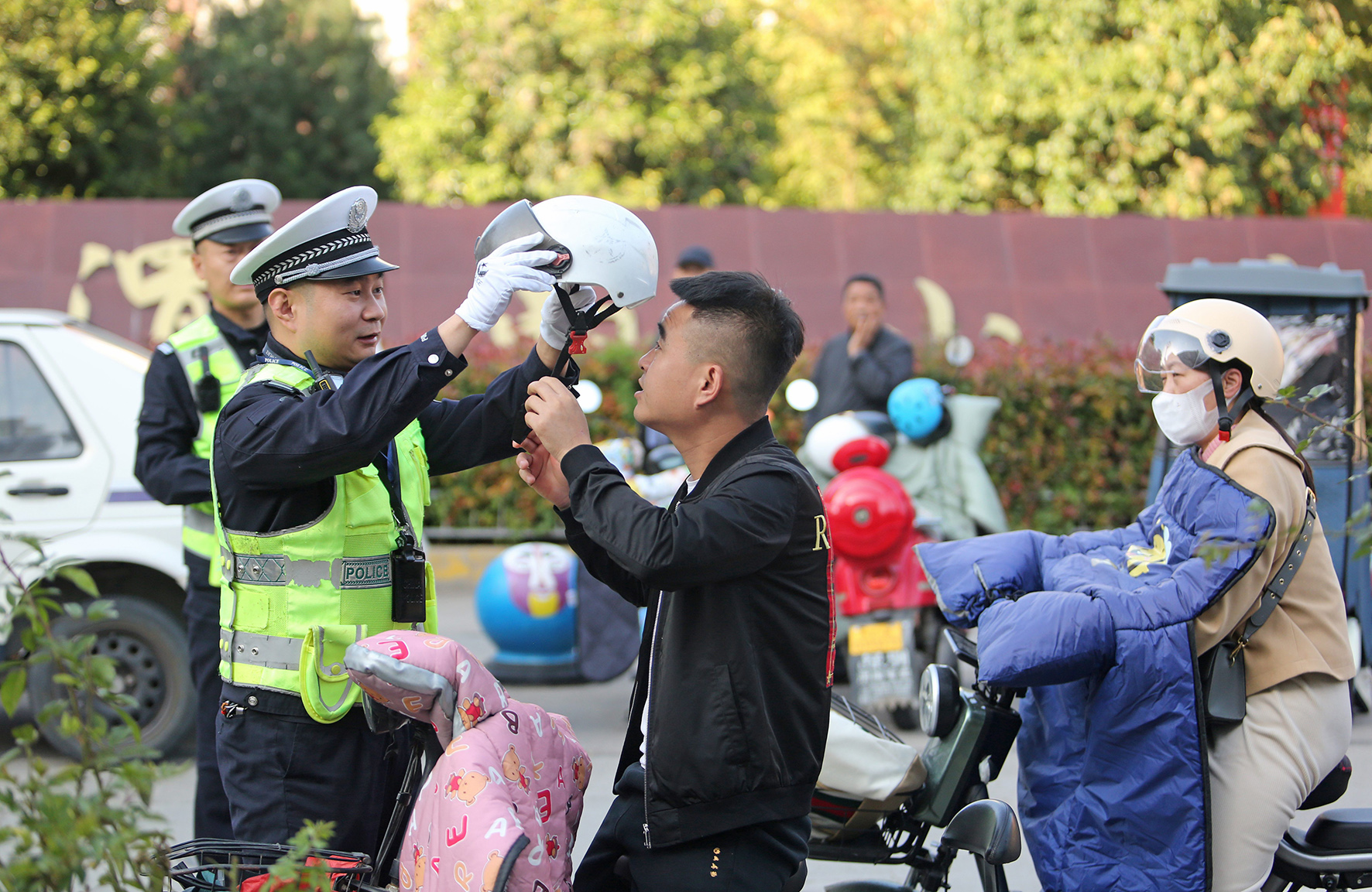 10月20日,陜西省渭南市區(qū)樂天大街中段,民警提醒市民佩戴好安全頭盔。連日來,陜西省渭南市公安局交警支隊(duì)組織中心城區(qū)開展“一盔一帶”專項(xiàng)整治行動(dòng)。民警采取“勸導(dǎo)+教育”的方式,對(duì)駕乘電動(dòng)自行車未佩戴安全頭盔群眾進(jìn)行查糾、勸導(dǎo),不斷提升市民安全出行意識(shí)。