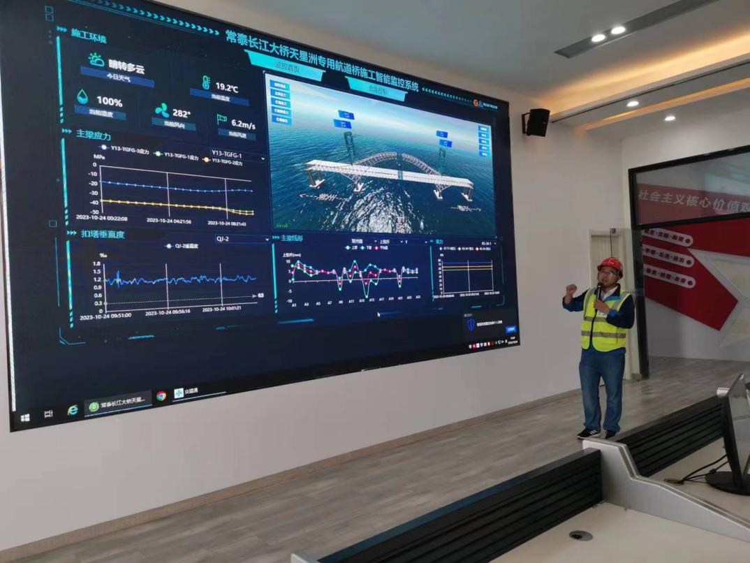 數(shù)字孿生系統(tǒng),不僅方便了解施工現(xiàn)狀,而且能進(jìn)行仿真推演,優(yōu)化施工方案。在天星洲專用航道橋施工過程中,利用數(shù)字孿生技術(shù),搭建云端無線采集系統(tǒng),全方位實(shí)時(shí)獲取橋梁施工相關(guān)數(shù)據(jù)。讓數(shù)據(jù)“在電腦上多跑路”,對施工控制數(shù)據(jù)進(jìn)行實(shí)時(shí)分析,實(shí)時(shí)預(yù)警,確保結(jié)構(gòu)施工過程始終處于可控狀態(tài);以不同顏色區(qū)分當(dāng)前桿件安裝狀態(tài),實(shí)現(xiàn)工序級別的形象進(jìn)度展示及基于工序的質(zhì)量驗(yàn)收;而且平臺(tái)內(nèi)可以對施工工序模擬,保障現(xiàn)場構(gòu)件保供安排,確保施工質(zhì)量、物資調(diào)度、進(jìn)度安排合理可控……
