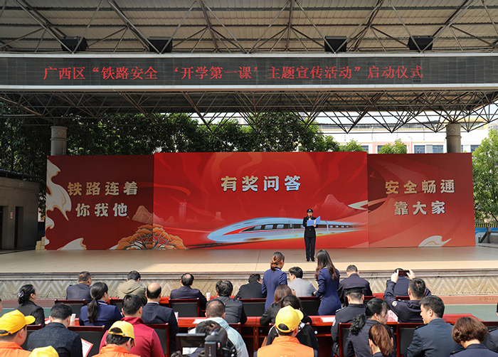 活動(dòng)現(xiàn)場(chǎng),錦華小學(xué)學(xué)生“紅領(lǐng)巾護(hù)路隊(duì)”代表宣讀愛路護(hù)路倡議書;學(xué)生表演《愛路護(hù)路我能行》節(jié)目,以快板和舞蹈的形式宣傳鐵路安全知識(shí);鐵路青年志愿者通過(guò)護(hù)路快板表演,將鐵路安全小知識(shí)改編成朗朗上口的順口溜,讓人印象深刻;南寧站派出所民警上臺(tái)講解鐵路安全注意事項(xiàng),進(jìn)一步提升未成年人法律意識(shí)和安全意識(shí)。