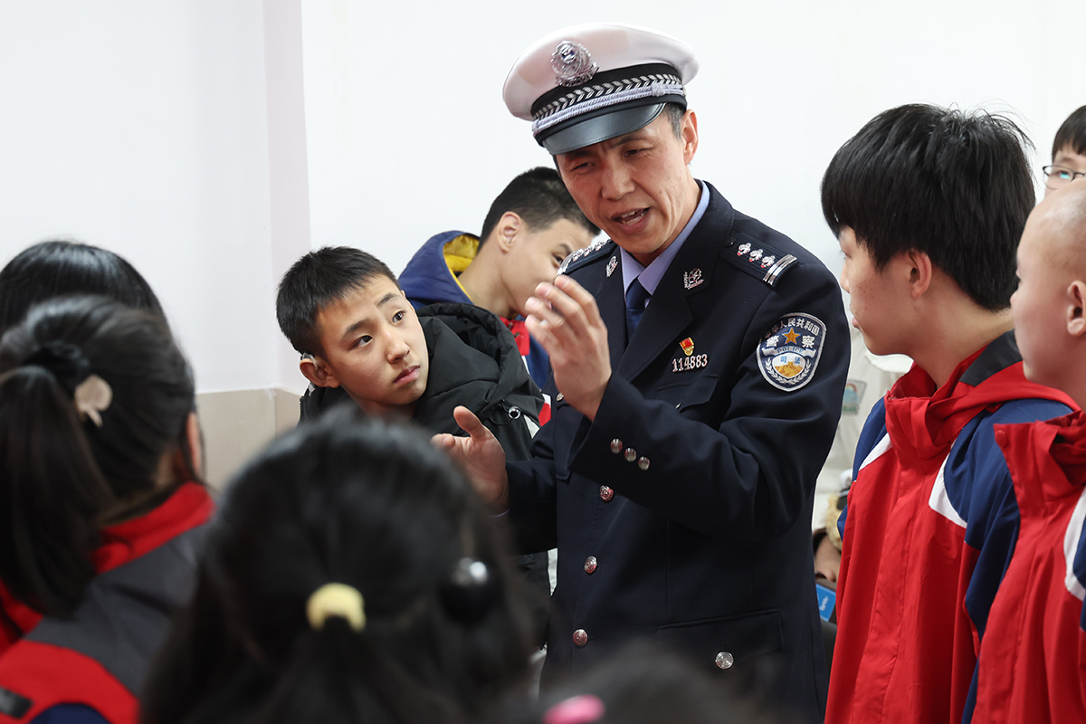 3月20日,遼寧省沈陽市公安局交通警察局大東大隊民警在聾啞學校用手語講解交通安全知識,并與同學們互動交流。