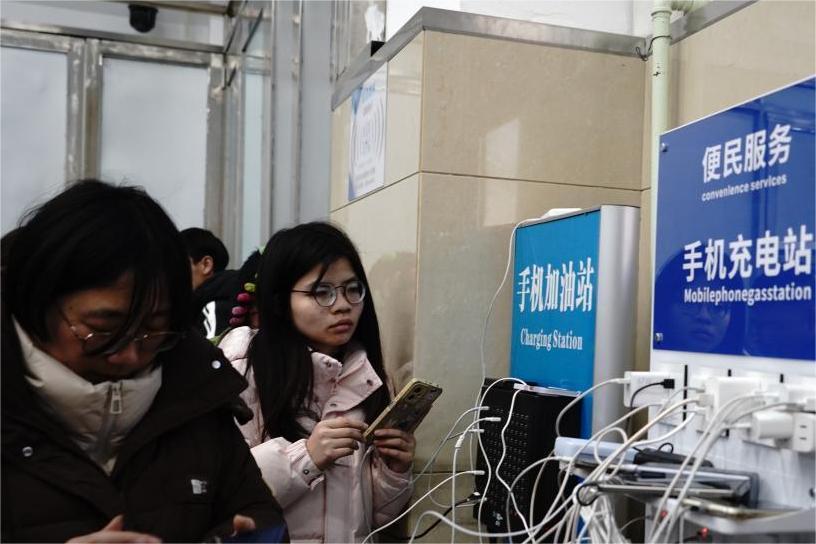 1月19日,在黑龍江省漠河市,游客在鐵路漠河站候車室內(nèi)免費(fèi)充電。戴錦镕/攝
